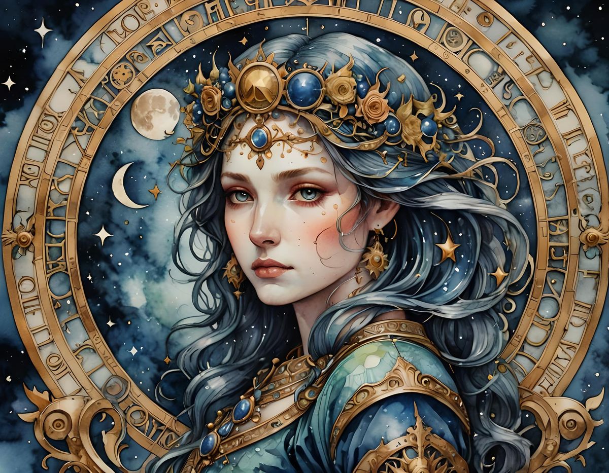 Virgo zodiac - alchemy signs - elements - moon Watercolor, trending on artstation, sharp focus, studio photo, intricate details, highly detailed, by greg rutkowski