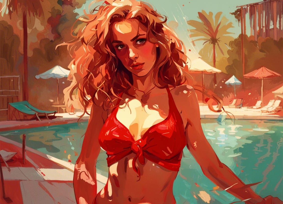 A pin-up style portrait of a young woman in a red bikini near a pool. The image features a bright, sunny setting and is rendered as digital art.