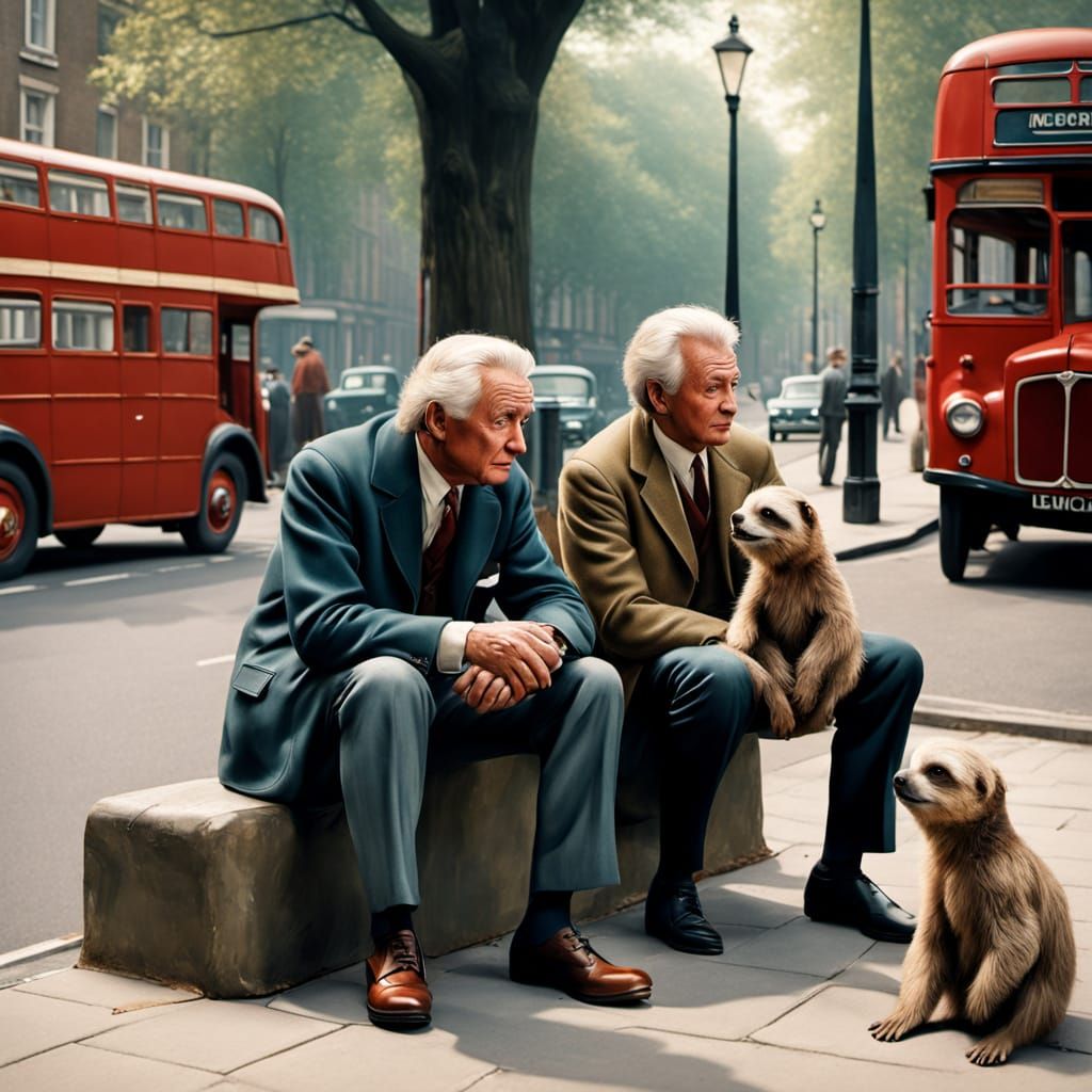 This image depicts a vintage 1960s London street scene featuring men in suits and a double-decker bus, with one man holding a sloth figurine, rendered in photorealistic digital painting with dramatic lighting.
