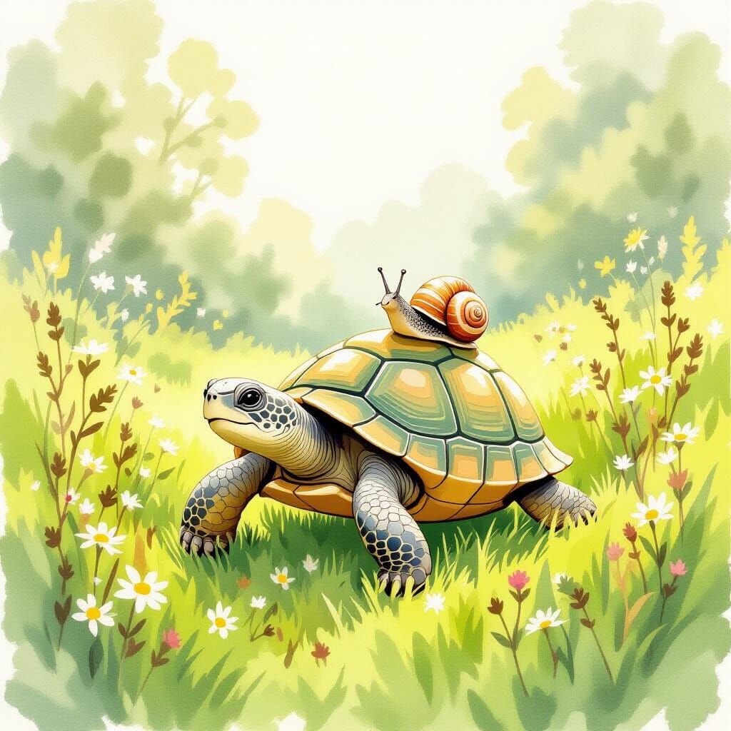 This watercolor illustration depicts a gentle turtle with a snail on its shell, walking through a lush meadow. It features warm pastel colors and a cozy fairytale atmosphere.