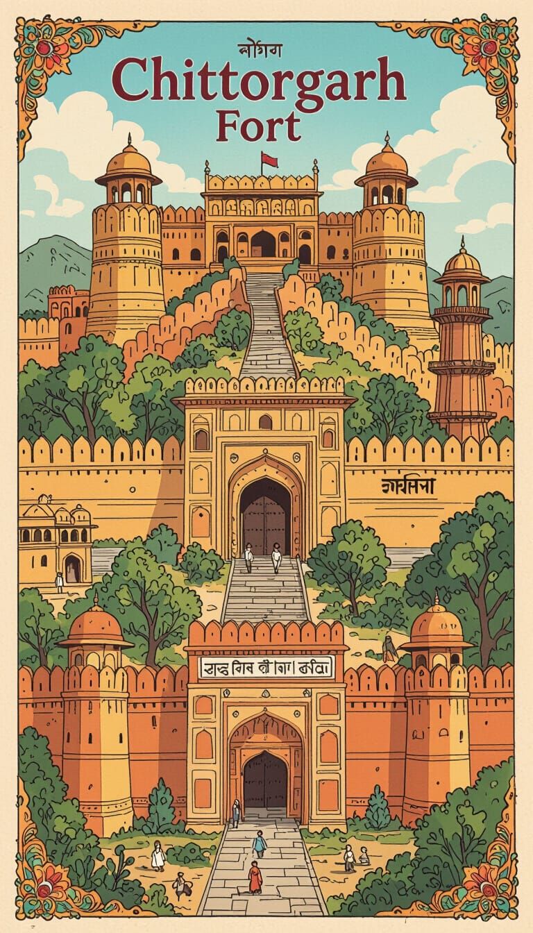 This image shows a brightly colored, illustrated map of Chittorgarh Fort with labeled gates and the Vijay Stambh. It is rendered in an artistic style incorporating elements of Mughal miniatures and Bengali folk art.