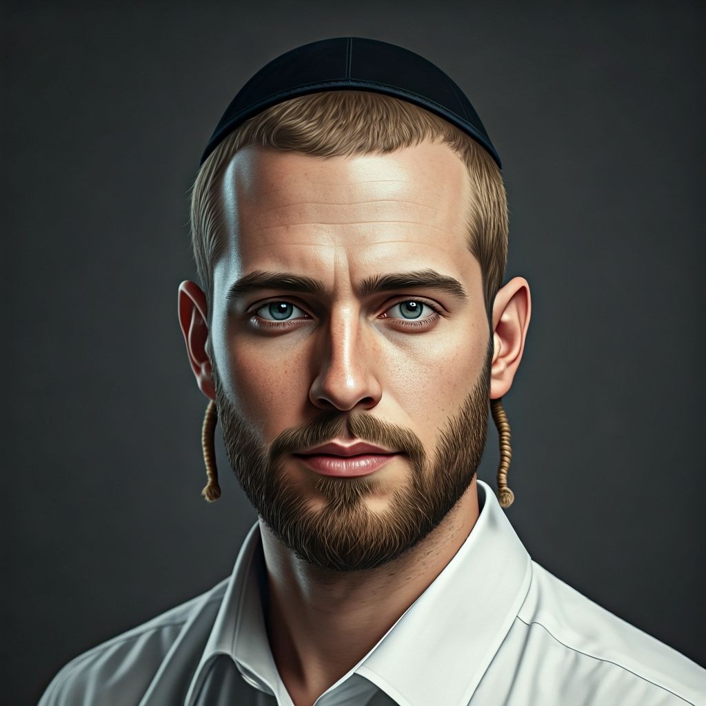 This image shows a realistic studio portrait of a young man with blonde hair, a neatly trimmed beard, and sidelocks. He is wearing a white shirt and black kippah, captured in a professional photography style.