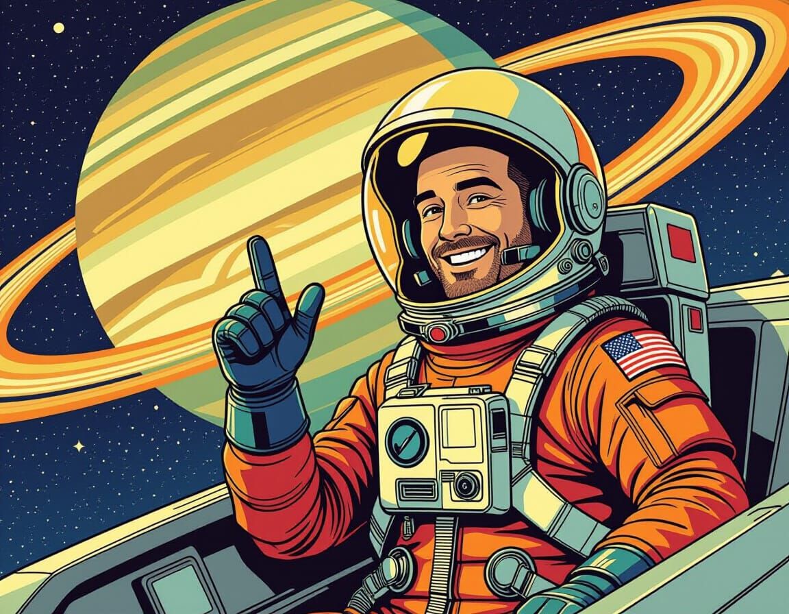 A vibrant comic book style image of an astronaut giving a thumbs up while piloting a retro spaceship near Saturn. The artwork evokes a surreal space adventure.
