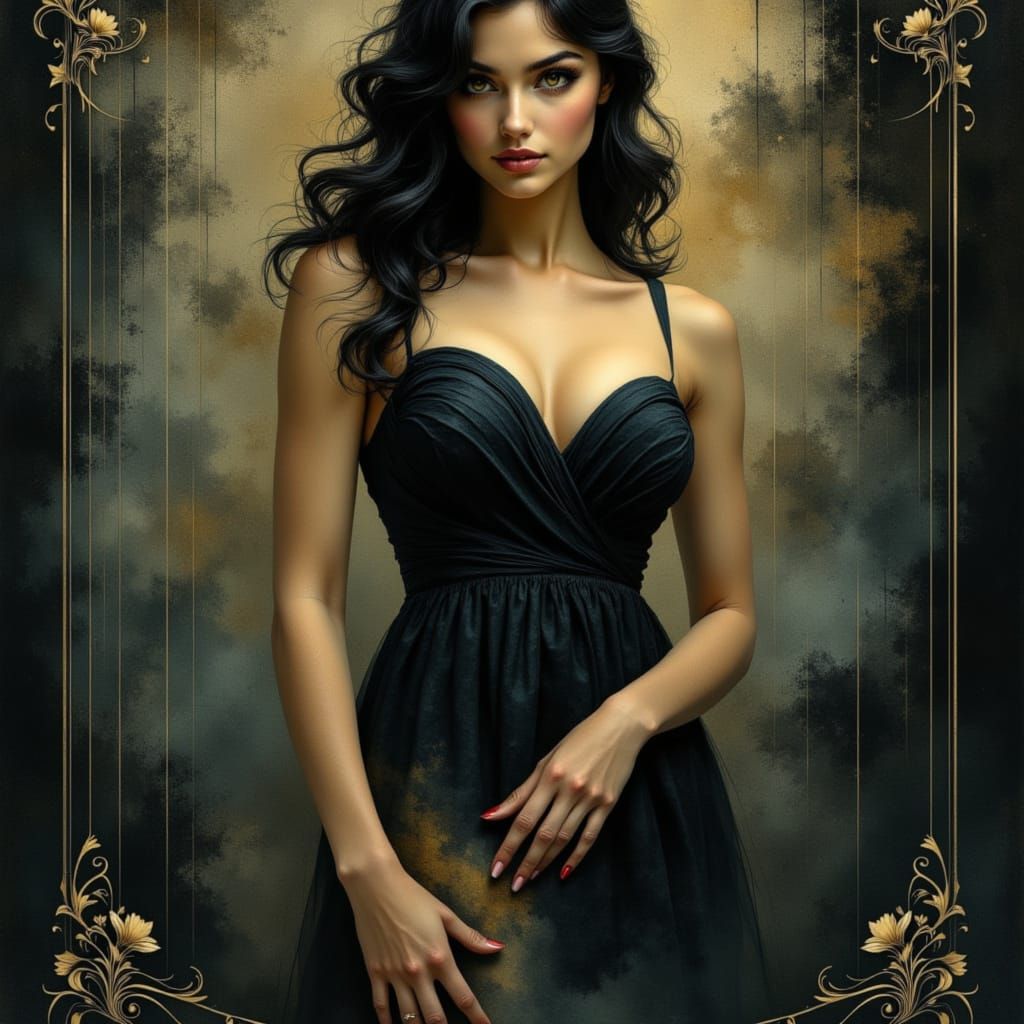 A striking picture of a curvy woman with dark, wavy hair, confidently posing in a fitted dress. The image features dramatic lighting and deep shadows, rendered in ink and watercolor with bold brushstrokes, in an Art Nouveau style.