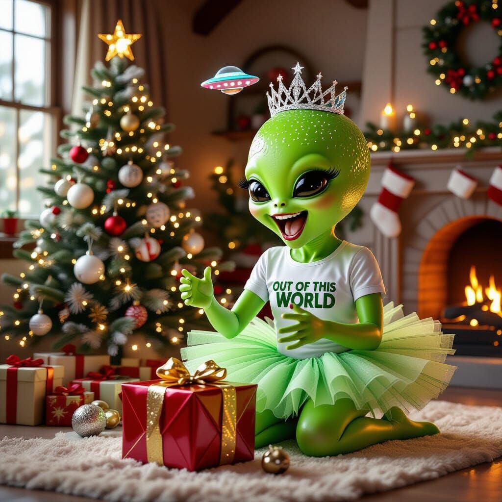 This image shows a hyperrealistic 3D render of a lime green alien in a Christmas tutu and tiara, opening a gift. The scene is set in a cozy, warmly lit room with alien-themed decorations and cinematic lighting.