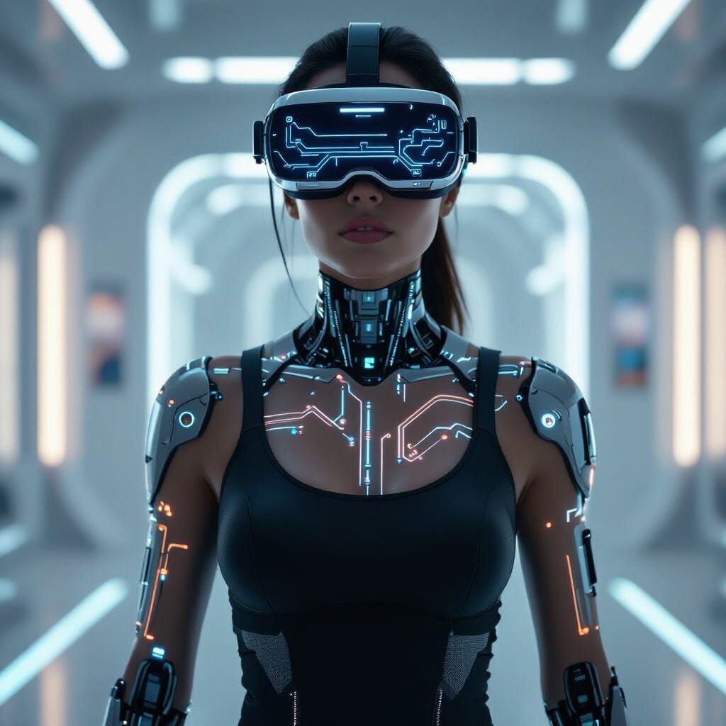 This hyper-detailed image shows a confident futuristic human with glowing neural circuits and biomechanical implants. Features include holographic tattoos and chrome details, set in a minimalist environment with soft neon reflections.