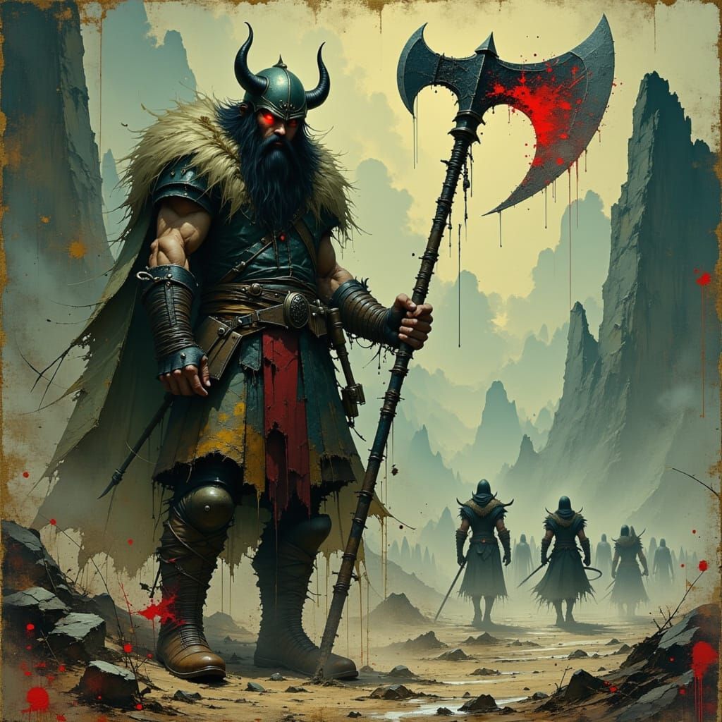 This image shows a Viking warrior on a desolate battlefield. He is clad in armor and a horned helmet, his eyes glowing red. The image evokes dark mysticism and brutal art.