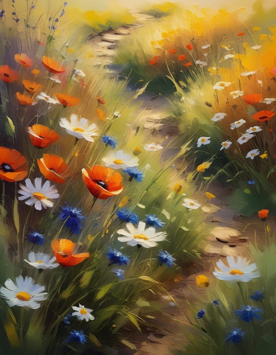 A close-up oil painting of a vintage wildflower meadow, complete with a winding path. Impressionistic in style, the work features expressive brushwork, soft golden light, and a warm color palette.