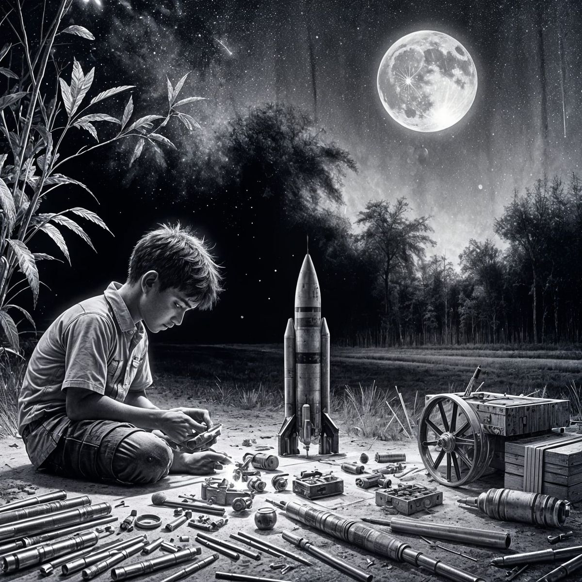 This image shows a young South-Asian boy building a model rocket in his garden at twilight. Rocket parts and tools are scattered around him as he works, with the moon visible above. The illustration is rendered in charcoal sketch style.