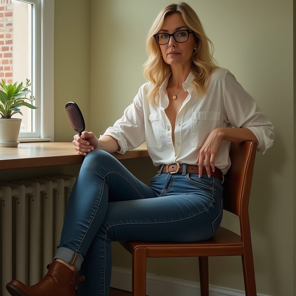 A digital painting of a blonde woman with glasses sitting on a chair and holding a hairbrush. The artwork has a soft, realistic style.