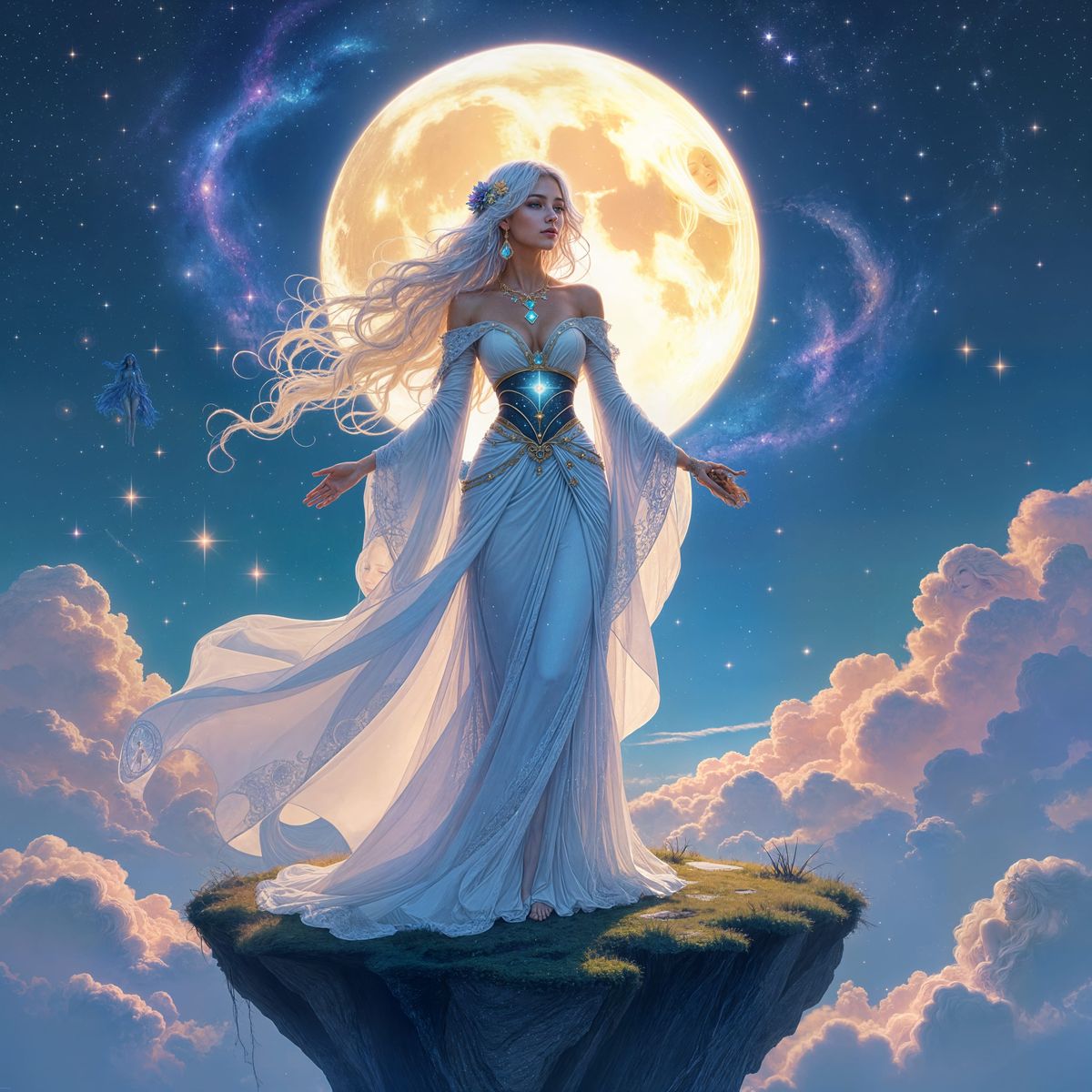 A captivating image of a celestial sorceress with starlight hair and cosmic jewelry, standing on a floating island. The scene showcases a swirling nebula and ethereal lighting in an art nouveau style.
