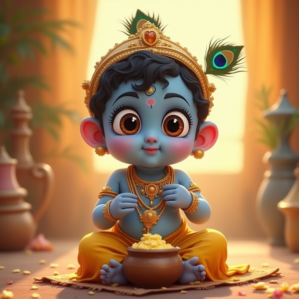 This image shows a charming cartoon-style baby Krishna with blue skin, golden jewelry, and a peacock feather crown. The digital art features a vibrant spiritual backdrop and soft lighting.