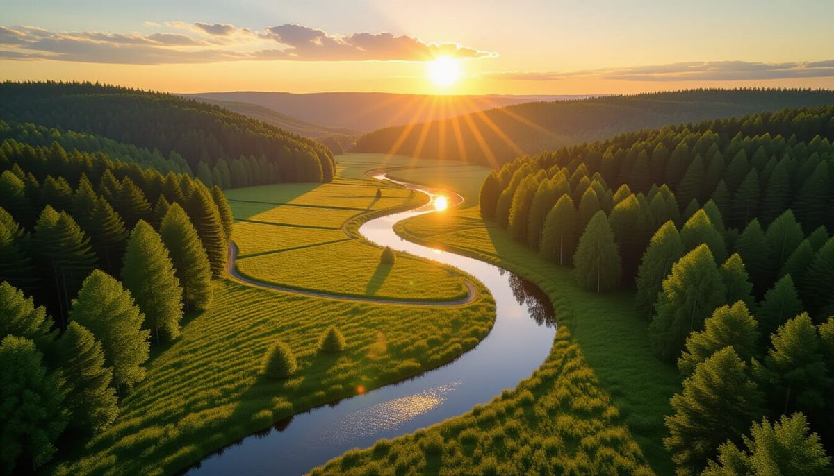 A striking picture of a hidden valley with a river reflecting the sunset. The valley is surrounded by lush forests and meadows, captured in a photorealistic style with vivid colors.