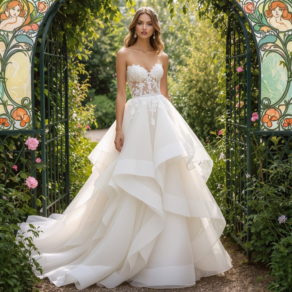 A striking picture of a woman in a wedding dress with a sweetheart neckline. The dress features embroidered lace, a tulle skirt, and satin bodice, rendered with soft impressionistic elements.