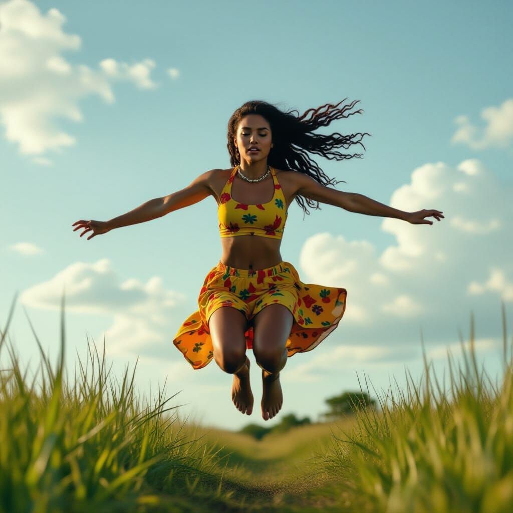 A dramatic, atmospheric film still capturing a Batusi woman in mid-leap. Features cinematic lighting, film grain, and rich color grading for a masterpiece quality.
