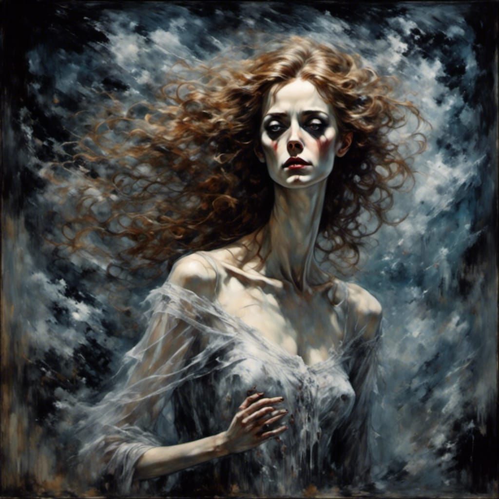 A dark fantasy portrait of a ghostly figure. The image features transparent elements and dramatic lighting, in a style evocative of classical fantasy art.