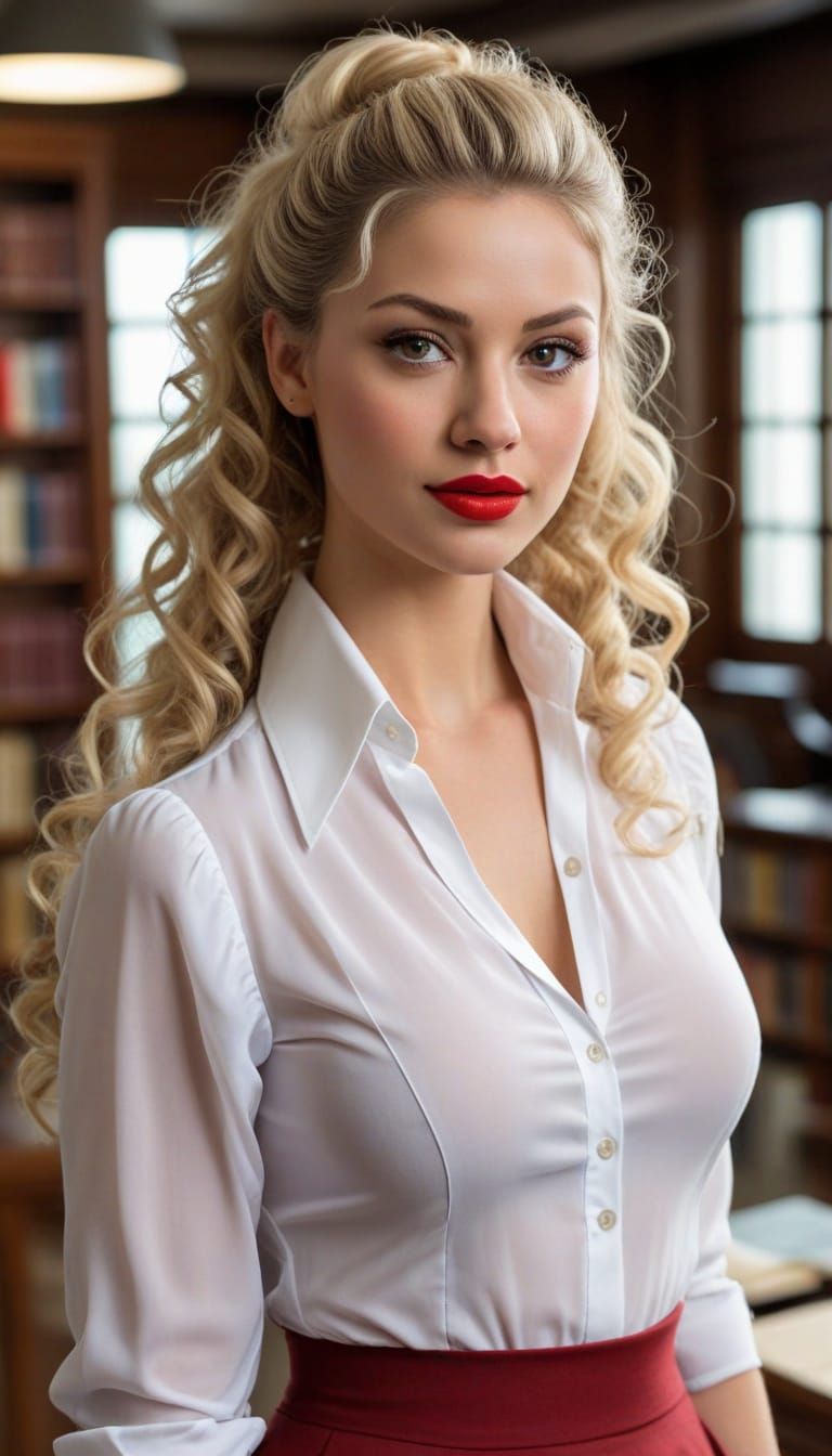 Young beautiful teacher, naughty smirk, standing in library, Blonde wide curls in long ponytail, Detailed pretty face, Hazel green eyes, glossy red lips, white unbuttoned sheer shirt, High round bust, enormous chest, French nails, Mini skirt, Full body photo, Pro lighting, frontal light, unblemished ...
