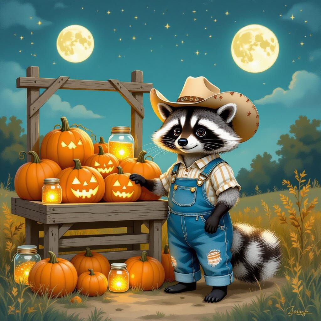A charming image of a raccoon wearing a cowboy hat and overalls, standing next to a farmstand filled with glowing pumpkins. The artwork has a soft, ethereal quality reminiscent of classic storybook illustrations.