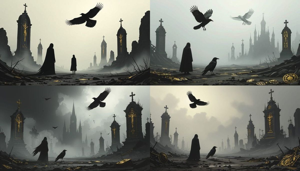 This image depicts a lone figure facing a black crow amidst thick fog and broken gothic structures. A white crow circles above, adding to the melancholic, fatalistic atmosphere in a dark fantasy, gothic steampunk art style.