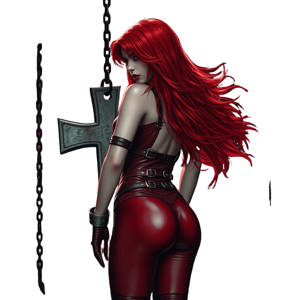 A dark and alluring image of a vampire woman in a crimson latex bodysuit, chained to a St. Andrew's cross in a foreboding cave, surrounded by ominous shadows and chains, set against a deep red background