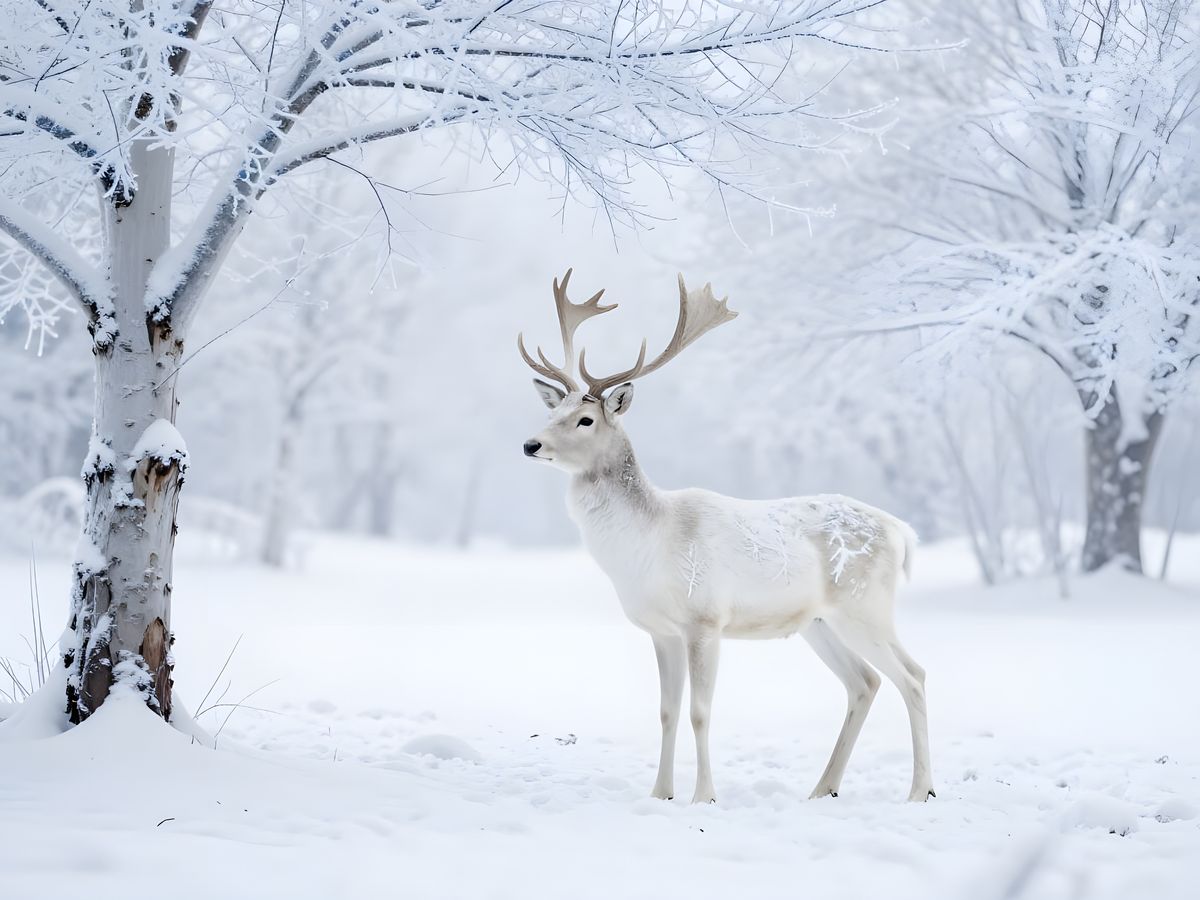 This image showcases a solitary, white deer covered in frost within a monochromatic winter scene. White trees with blue-white frost surround it, creating a surreal and minimalist aesthetic.