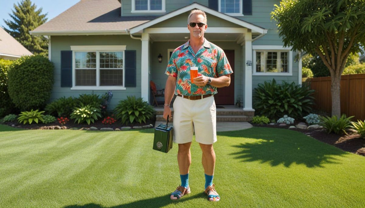 A vibrant image shows a father figure standing in front of a pristine lawn. He wears a Hawaiian shirt and holds a grill spatula and a trophy, rendered in a style reminiscent of classic American paintings.