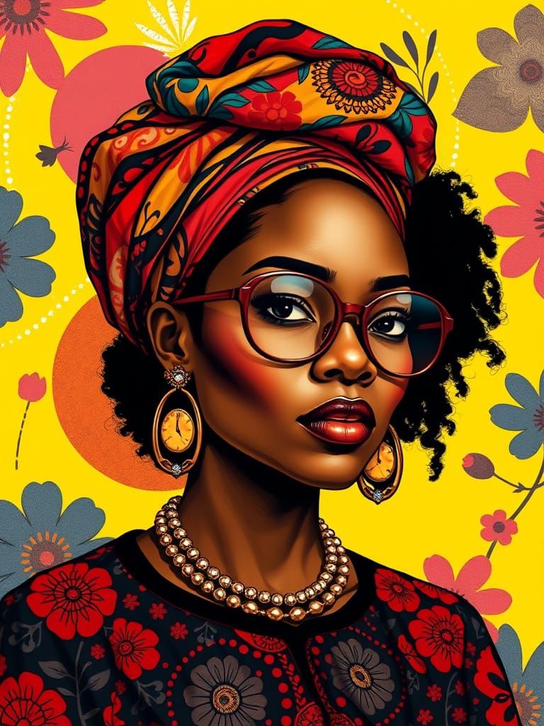 This image shows a stylish woman sporting an afro, round glasses, and statement jewelry. The artwork features vibrant colors, abstract shapes and floral patterns in a modern graphic style.