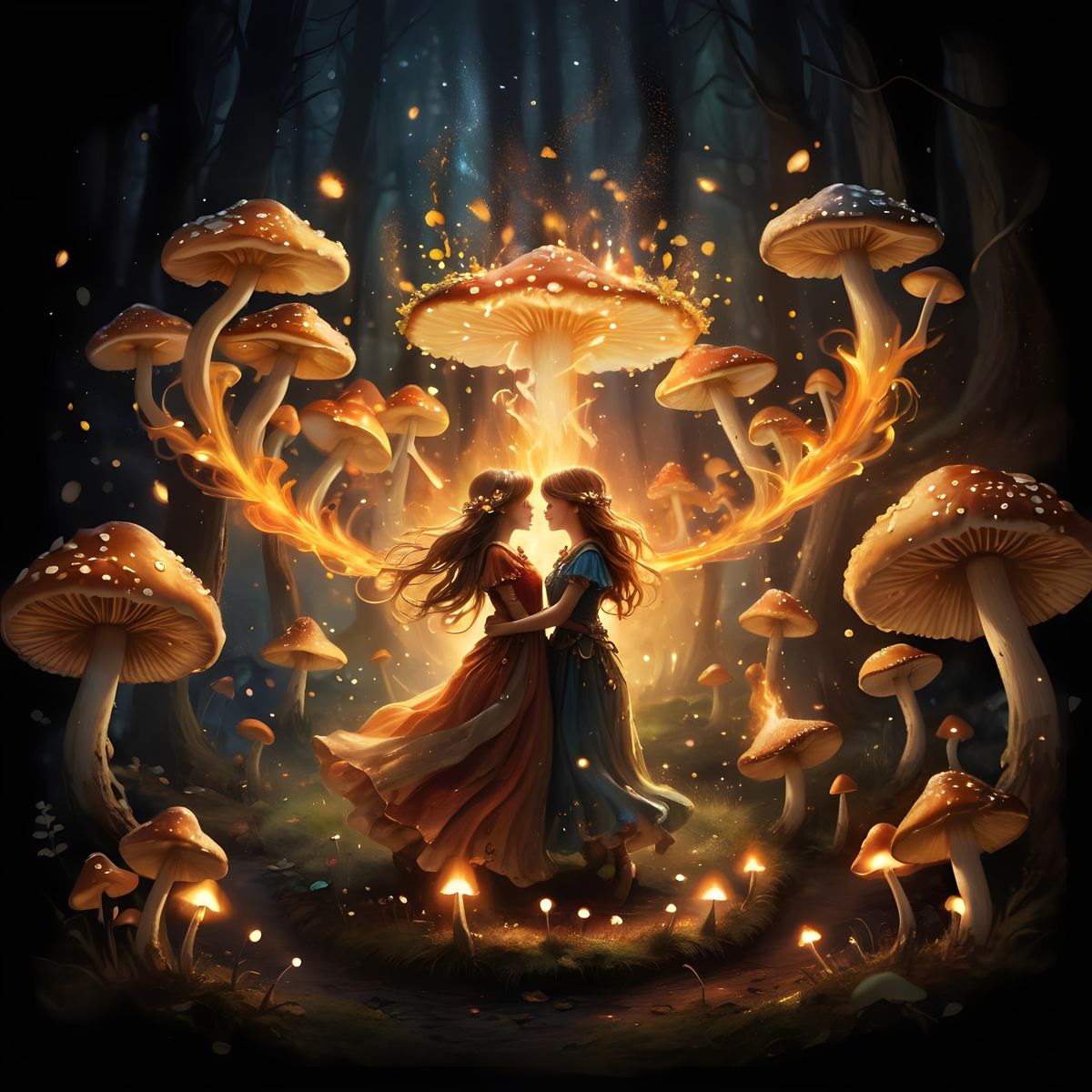 This image shows two flame sprites dancing within a circle of mushrooms. The digital art captures the joyful movement of the twin fire beings in a magical setting.