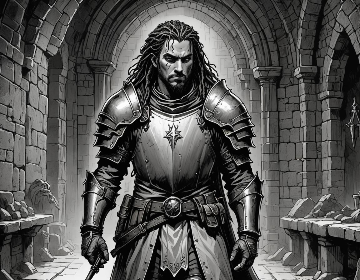 This image shows a black and white comic book style sketch of a dread knight in a medieval dungeon. The artwork captures a classic fantasy aesthetic.