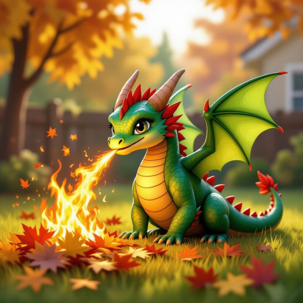 A friendly, miniature emerald dragon uses a controlled fire breath to burn autumn leaves in a suburban backyard, depicted in a vibrant, illustrative children's book style with warm, dappled lighting.