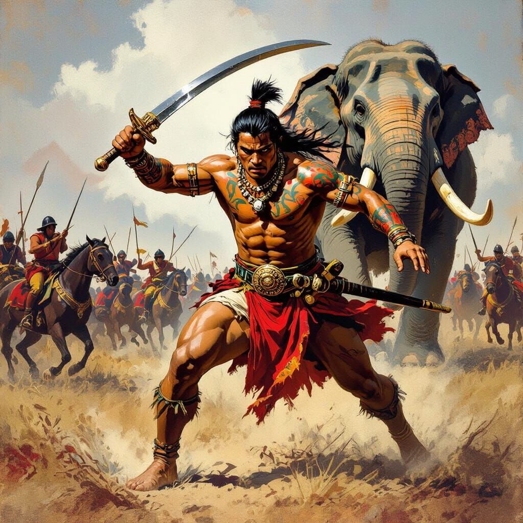A dynamic image of a Burmese warrior charging into battle. The figure is covered in tribal tattoos and wields a curved sword amidst a chaotic war scene with cavalry and a war elephant, depicted with intense brushstrokes.