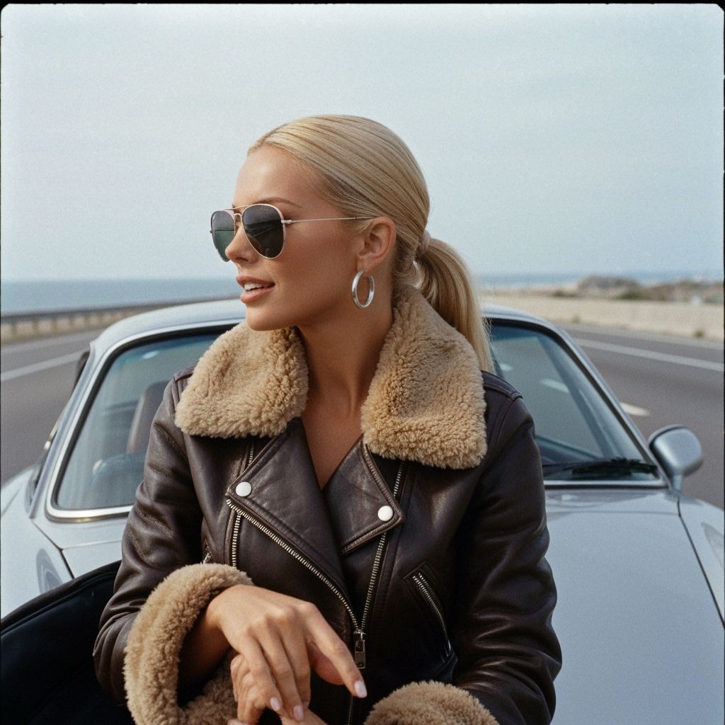 This image captures a beautiful pinup model in a 1970s vintage style, driving a silver Porsche 911 along a scenic coastal highway, complete with film grain for an authentic retro feel.