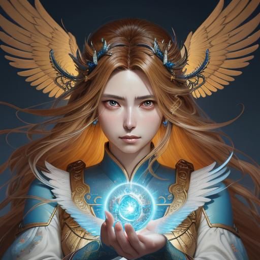 A vibrant digital painting of Belldandy with wings and a goddess figurine, head and shoulders. The portrait features dynamic lighting and exaggerated manga proportions with divine elegance in a digital art style.