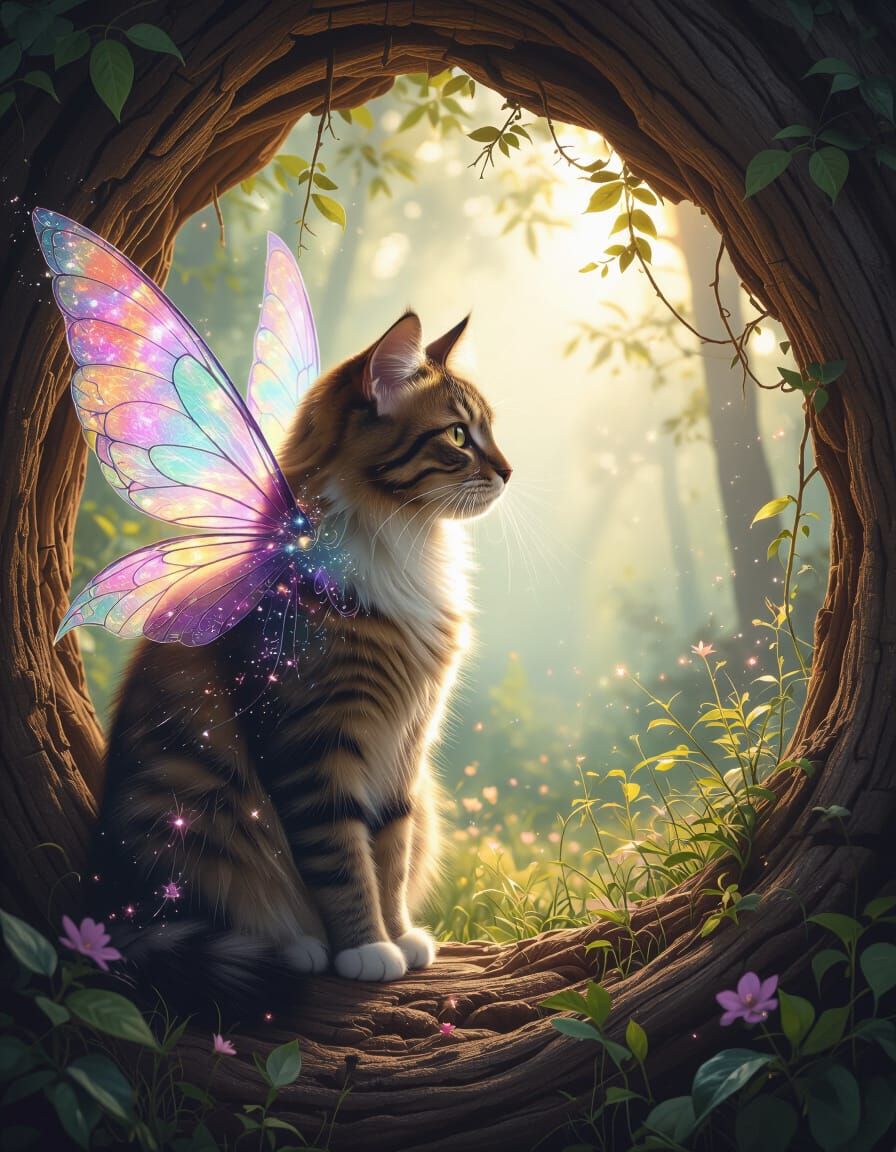 This surrealist image features a double exposure of a cat and a fairy, blending ethereal wings and magical particles. It shifts between a forest glade and a hollow log, with luminous colors creating a dreamlike effect.