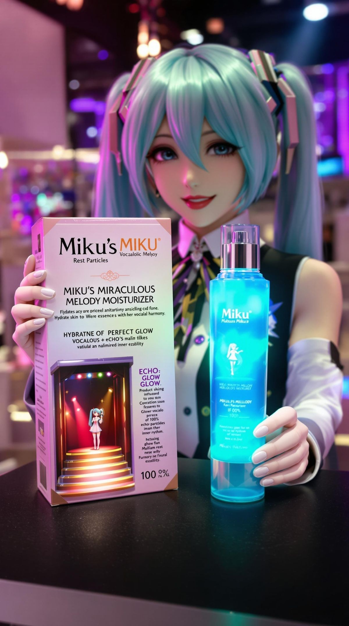 This image shows Hatsune Miku dressed in a stylish sales outfit, showcasing her signature product: a glowing moisturizer with a miniature stage and vocaloid-themed branding, promising hydration and elasticity with a futuristic twist