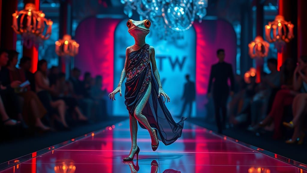 This image shows an anthropomorphic gecko fashion model on a runway. The gecko is wearing high heels and a beaded chiffon gown in a hyperrealistic, cinematic style with neon accents.