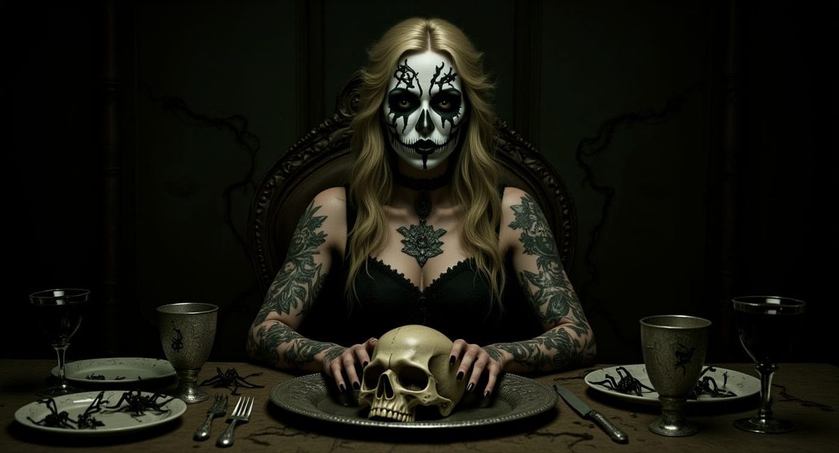 This hyperrealistic image depicts a gothic woman with intricate sugar skull makeup and black filigree, seated alone at a decaying banquet table with a human skull. The scene evokes lonely, elegant horror.