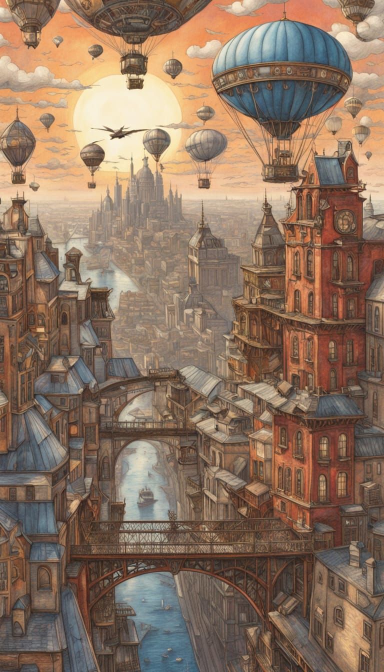 This image depicts a 19th-century steampunk city at sunset, rendered in a colored pencil and watercolor graphic style. It features intricate empire buildings, bridges, and airborne transport under dynamic lighting.