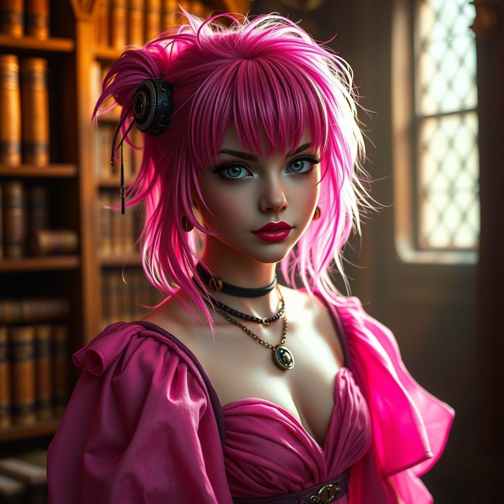 This digital art features a beautiful steampunk punk fairy with vibrant pink hair and flowing pink garments. The image uses cinematic lighting and a soft amber glow, reminiscent of fantasy illustration.