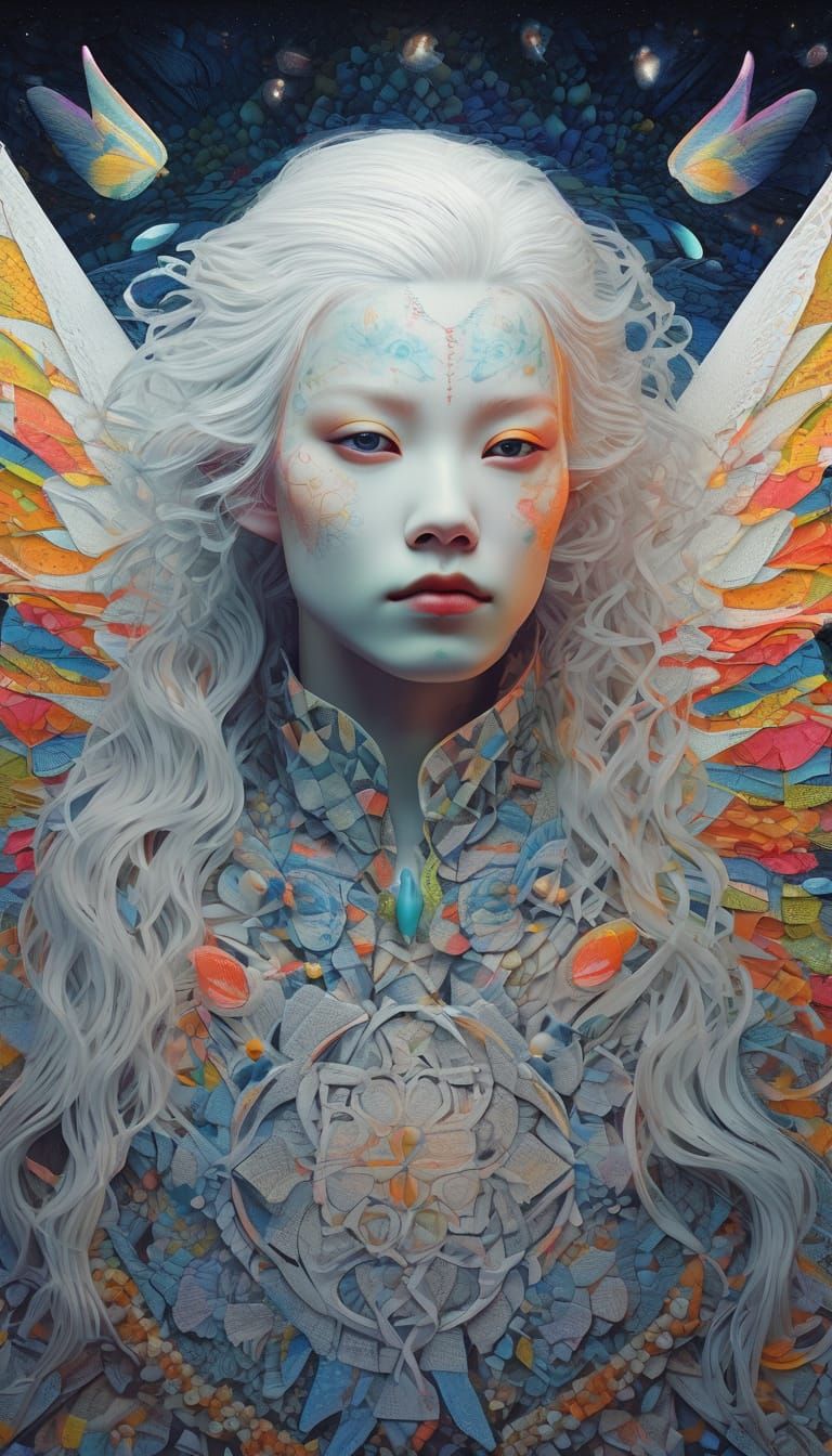 A striking picture of a fairy with white hair and glassine skin. The artwork blends zentangle and pointillism with vibrant, fluorescent colors and encaustic textures in a hyper-maximalist style.