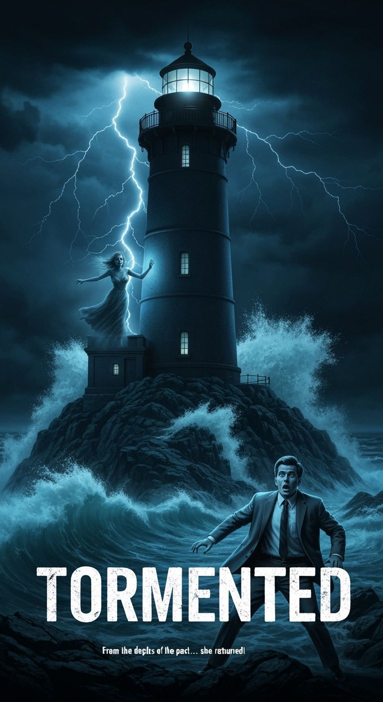 A surreal picture of a haunted lighthouse at night during a storm. A ghostly woman hovers near the light as a terrified man watches from below. The image is rendered with stark shadows in a horror aesthetic.