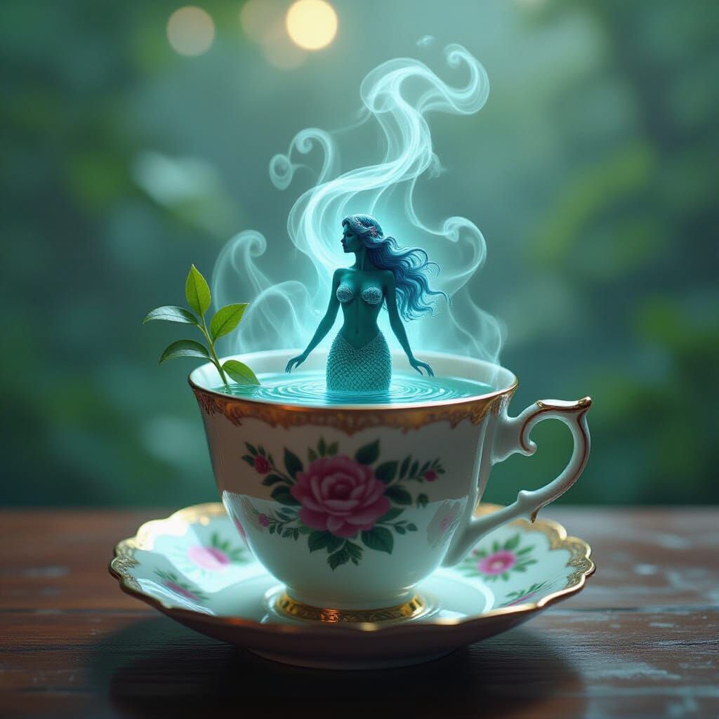 This image shows a surreal rainforest inside a teacup. A mermaid rises from the cup, surrounded by steam. The image has dreamlike colors, cinematic lighting, and a film-noir aesthetic.
