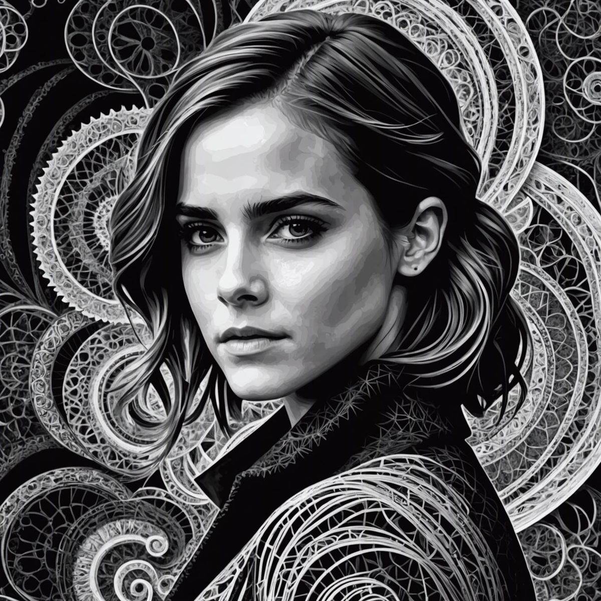 This image shows a black and white portrait of Emma Watson rendered in a complex abstract style. It features vector fractal patterns, wave functions, and Zentangle-inspired 3D shading.