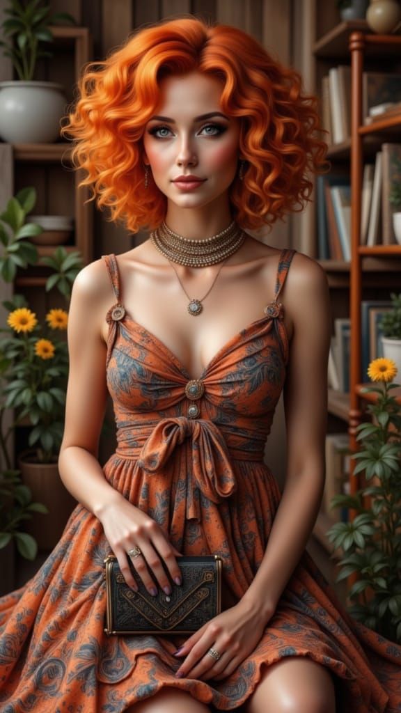 This hyperrealistic image shows a talented young woman with rainbow hair and a sly smile, in her cozy bohemian dorm room. Features dynamic lighting and a full body shot.