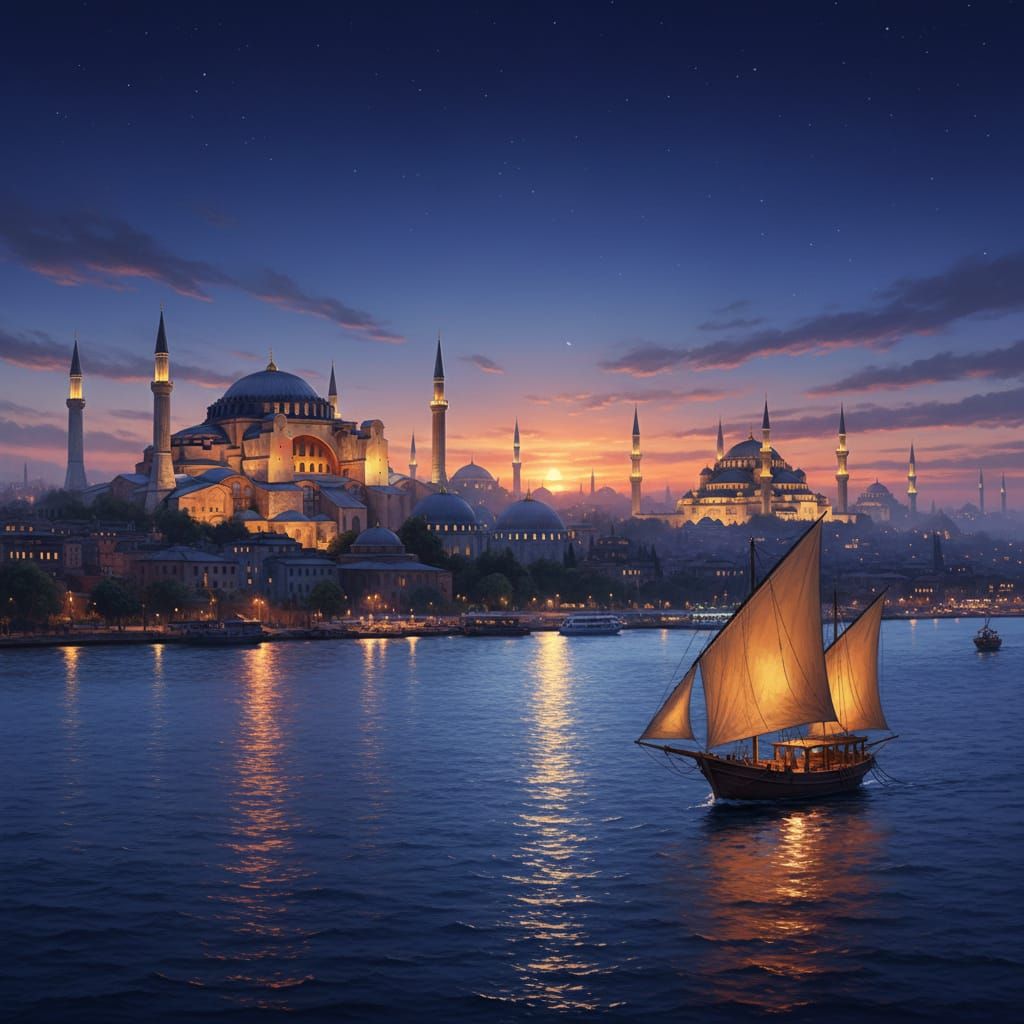 A hyperrealistic digital painting of Istanbul at twilight, showcasing illuminated mosques and the shimmering Bosphorus. A lone dhow sails, reflecting warm, jewel-toned city lights and moonlight. Evokes the city's grandeur and mystique.