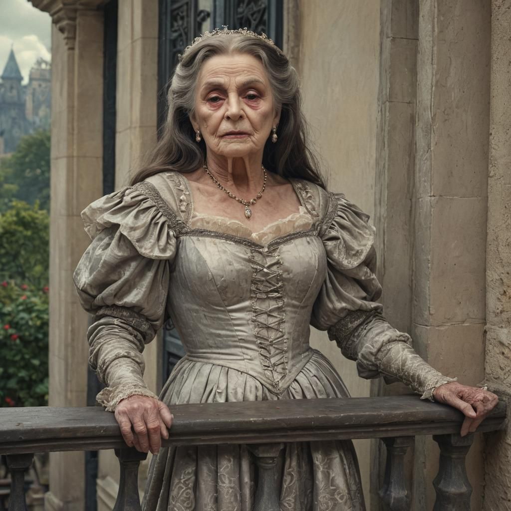 This image shows an elderly transvestite dressed as Juliet on a balcony. The digital painting features vibrant colors, romantic undertones, and intricate details, with a warm golden sunrise and dramatic shadows.