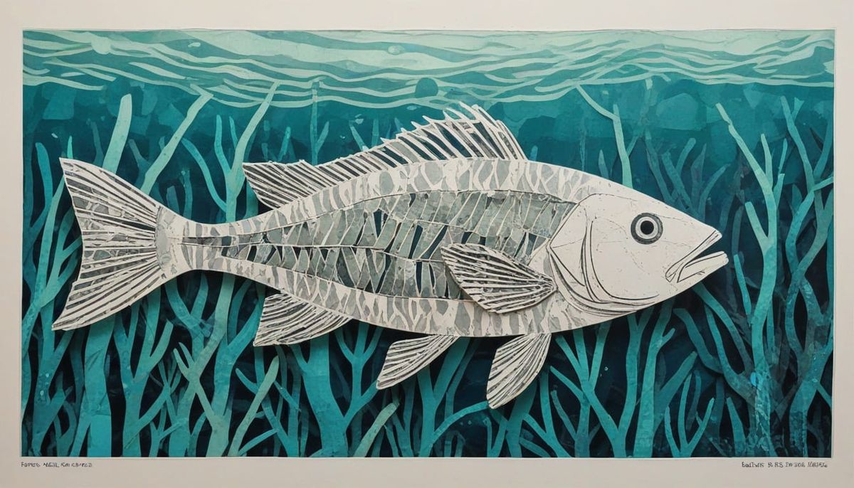 This image shows a collage of a friendly fish crafted from newsprint. The background features a kelp forest, also made from torn newsprint, creating a textured, paper-cut aesthetic.