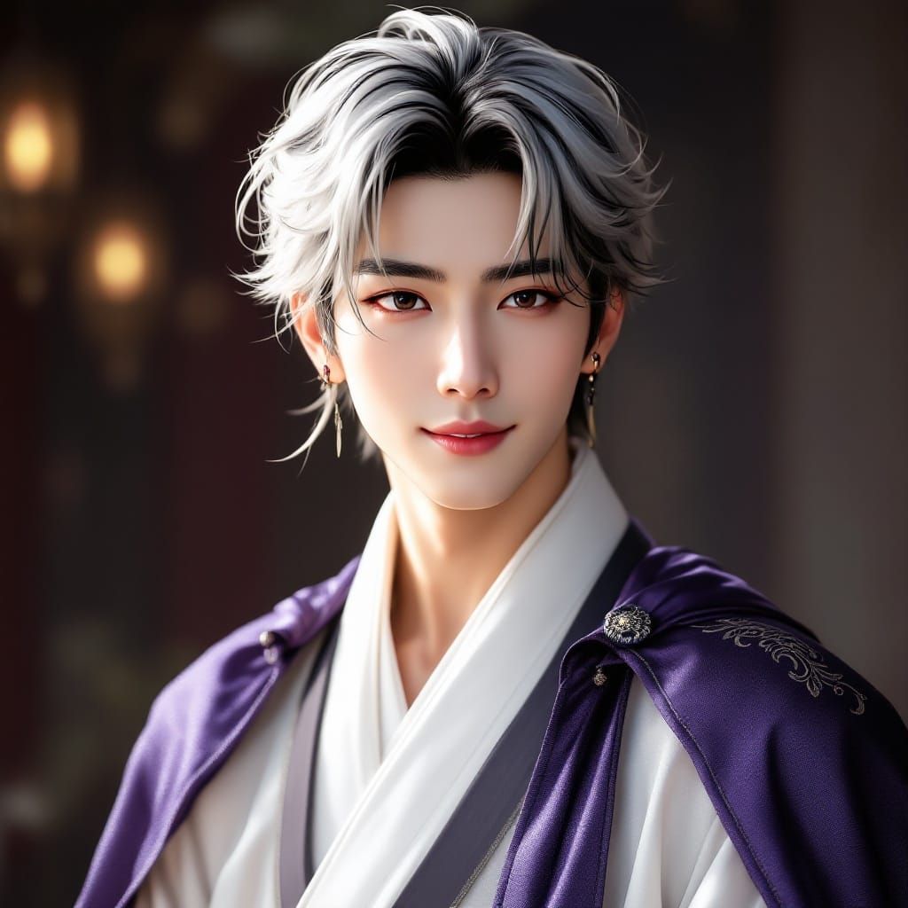 A carefree prince with a mischievous grin and majestic white hair adorns traditional hanbok attire with regal purple cloak, surrounded by fantasy palace grandeur.