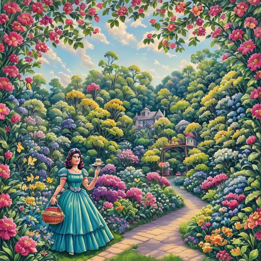 A vibrant oil painting in a pop art style featuring a cartoon character in a unique glass dress within a detailed Victorian garden setting.