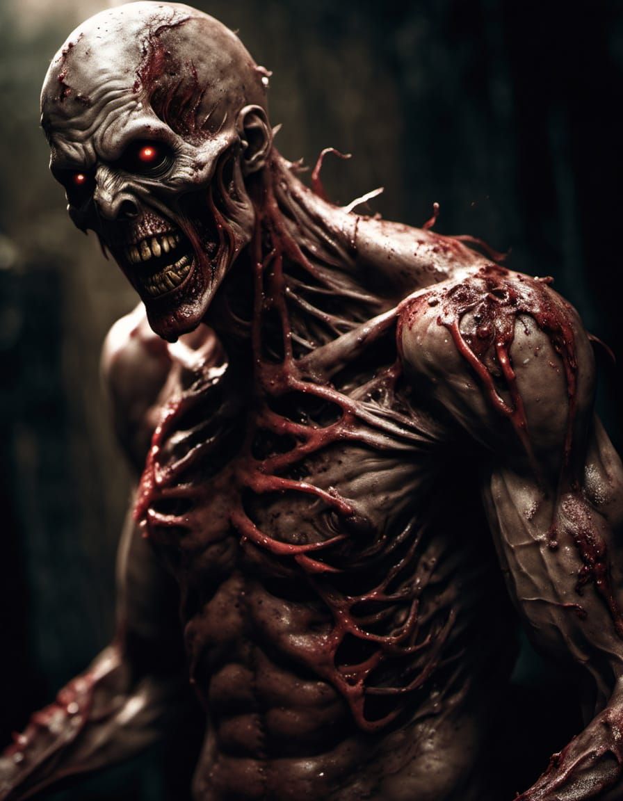 A haunting, high-contrast image of a faceless figure with twisted, inhuman features, set against warm sepia tones with splashes of electric crimson, evoking a sense of dark, unsettling horror